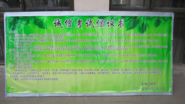 树道德之新风,立诚信之根基,是当代青年大学生义不容辞的责任。临近期末考试,为营造良好的考风,杜绝舞弊行为,净化考场环境,生物工程系特向全系学生发出诚信考试倡议,号召全系同学在期末考试中自觉遵守考场纪律,展现出自我的真实水平。