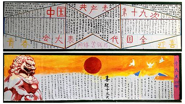 此次板报评比活动从任务布置到评比历时三周。同学们在班主任的指导下,集思广益,各自发挥特长,用自己的巧手,你绘图、我写字、他上色,团结协作,制作出一块块设计精美、主题突出、图文并茂的展板。每一幅板报都体现了当代大学生对党的十九大、对祖国的深厚情感。