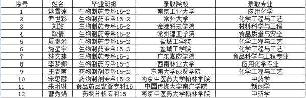 日前,普通高校“专转本”录取工作已落下帷幕,生物工程系共有22名应届毕业生达线,12名学生顺利被本科高校录取,其中8名学生被二本院校录取,占录取人数的66.7%。生物制药专科15-2班蒋雪莲同学以315分的高分被南京工业大学应用化学专业录取。