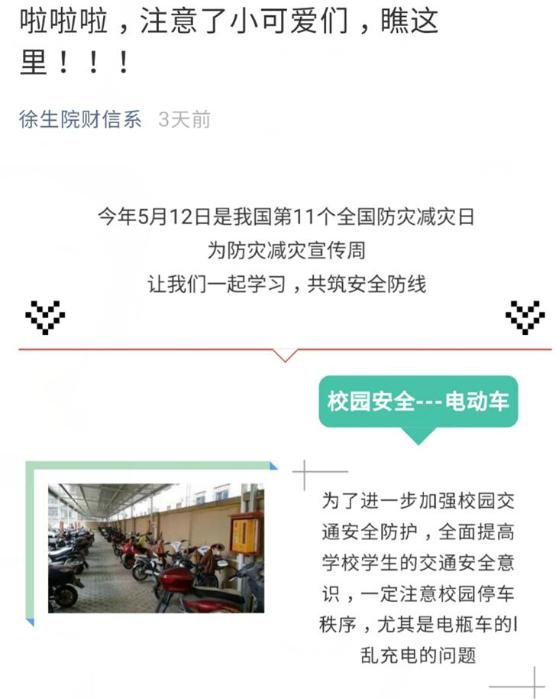 财经信息系结合校园特点,积极创新宣传手段,拓宽宣传渠道,丰富宣传内容,提高宣传实效,增强师生防灾减灾意识,普及推广防灾减灾知识和避灾自救技能。利用条幅、板报、微信公众号、安全知识在线测试等途径不断扩大宣传活动覆盖面,普及各类灾害知识和防范应对基本技能,掌握基本的自救互救知识和应急避险常识提高应对突发事件的能力。