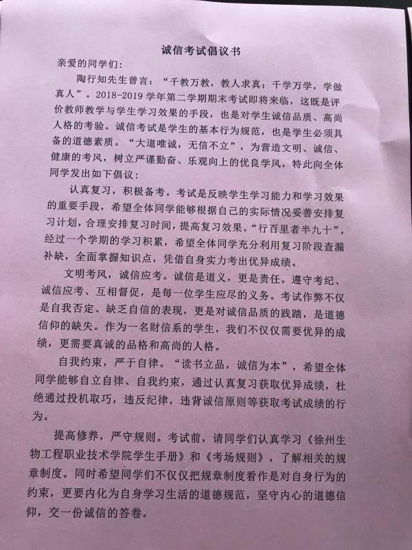 为营造良好学风校风,培养自立自律、刻苦学习的作风,财经信息系印发诚信考试倡议书号召全系同学在期末考试中自觉遵守考场纪律,杜绝各种考试舞弊行为,净化考场环境,展现自我的真实水平,用真实的成绩证明自己的实力。全系学生积极响应,并在倡议书上郑重的签下自己的名字。
