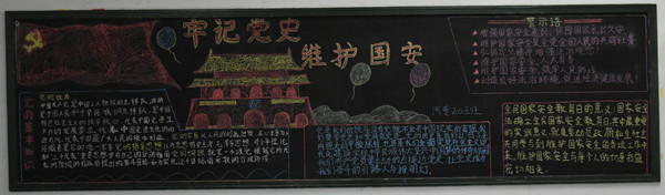 今年4月15日是我国第六个全民国家安全教育日,为深入开展国家安全教育活动,培养和增强当代大学生国家安全责任感和使命感,进一步加强大学生对国家安全的认识,普及国家安全知识,增强大学生国家安全观念,激发同学们爱国爱党热情。我院举办了以“深化党史教育、维护国家安全”为主题的板报评比活动。