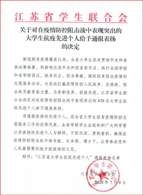 7月10日,江苏省学生联合会下发文件《关于对在疫情防控阻击战中表现突出的大学生抗疫先进个人给予通报表扬的决定》,其中我校农林工程学院团总支学生王洪禧、信息管理学院团总支学生黄德阳受到通报表扬。 新冠肺炎疫情爆发以来,我校青年学生积极响应党团组织号召,踊跃投身到返乡志愿服务活动中,为坚决打赢疫情防控人民战争、总体战争、阻击战贡献青春力量。希望广大团员青年以受到表扬的先进个人为榜样,不惧险阻、勇挑重担,在学习和实践中坚定制度自信,绽放青春之花。