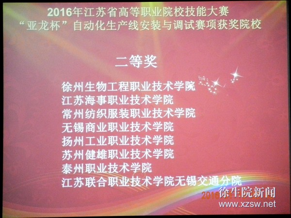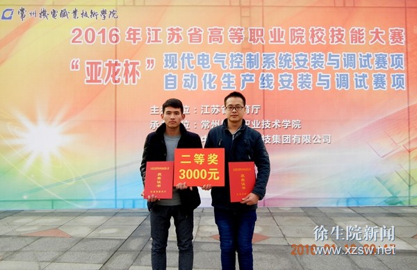 在刚刚结束的2016年江苏省高等职业院校技能大赛“自动化生产线安装与调试”项目比赛中,由我院史先焘、王珂老师指导的机电一体化技术专业周亚、周威两位同学,凭借过硬的装配工艺和熟练的编程调试,以总分第五名的成绩荣获该项目二等奖。