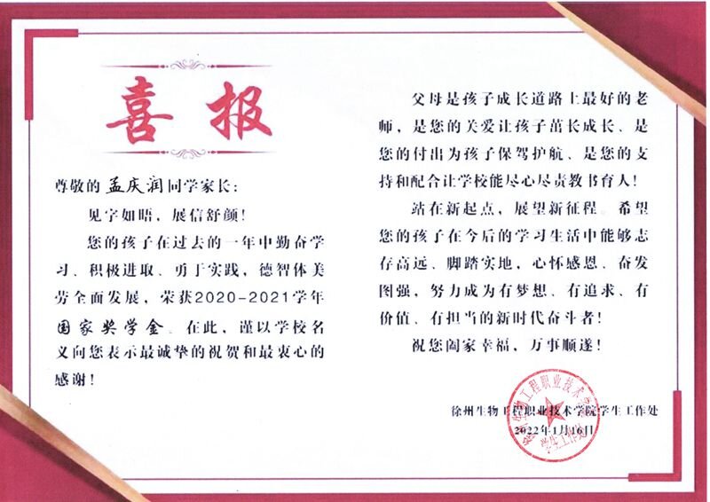为深化学校评奖评优效果,拓宽育人途径,促进家校合力育人,学校向181个学生家庭寄送虎年专属“喜报”, 涵盖“国家奖学金、国家励志奖学金”等多项荣誉,让家长分享子女在校成长的收获与喜悦,共同展望美好未来。目前,大部分喜报已寄送到学生家里,受到获奖学生及家长的一致好评。