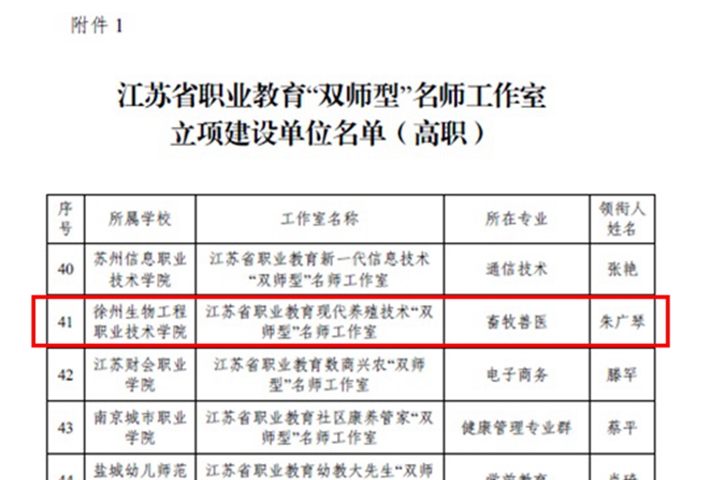 2022年8月2日,江苏省教育厅关于公布首批江苏省职业教育“双师型”名师工作室和技艺技能传承创新平台建设单位名单的通知公布,我校动物工程学院朱广琴教授领衔的“江苏省职业教育现代养殖技术‘双师型’名师工作室”被成功立项建设,获批建设经费30万元。