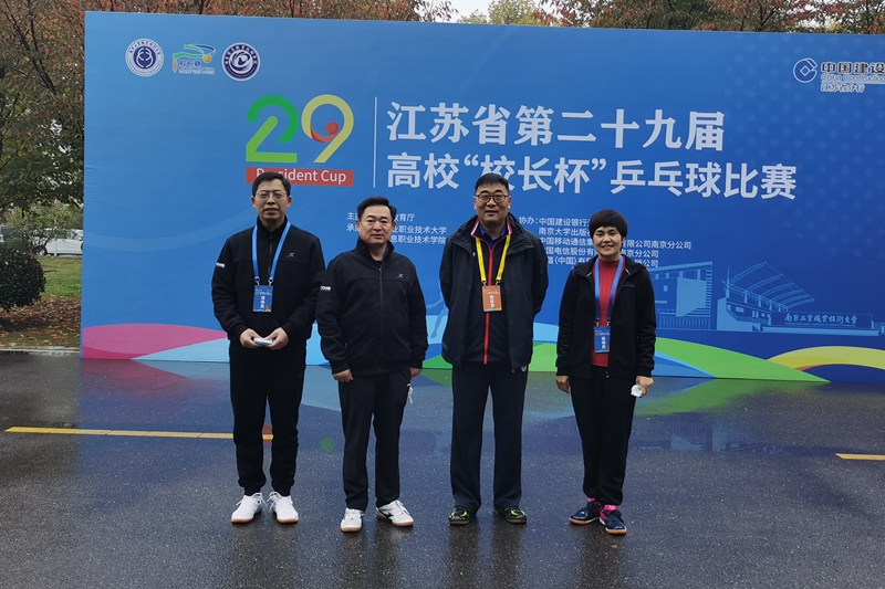 11月19日—20日,由江苏省教育厅主办,南京工业职业技术学院、南京信息职业技术学院承办的江苏省第29届高校“校长杯”乒乓球比赛在南京举行,我校党委书记谢建林,党委副书记、校长徐锋,党委委员、副校长王安雷,党委委员、纪委书记谭红玲组成代表队参加比赛。