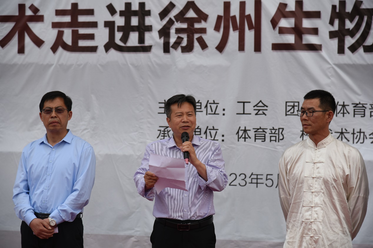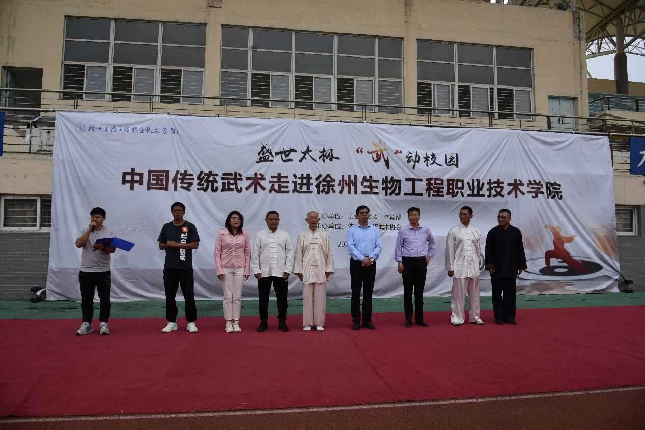 5月17日下午4点,由徐州生物工程职业技术学院体育部、工会、团委和校武术协会联合举办的盛世太极 “武”动校园活动在学校泉山校区田径场隆重开幕。党委委员、副校长王安雷,工会主席李德志,体育部主任周奎生和团委书记徐媛媛等领导参加了开幕式。