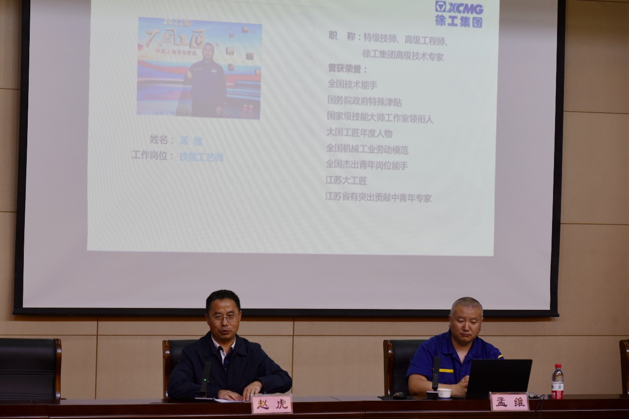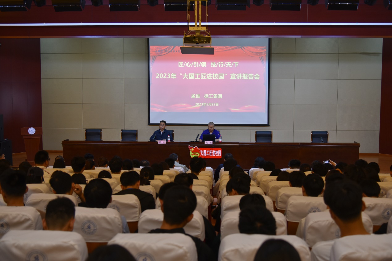 为深入学习贯彻党的二十大精神和习近平总书记关于职业教育的重要指示精神,大力弘扬劳动光荣、技能宝贵、创造伟大的时代风尚,让工匠精神成为广大学生成长、成才的精神动力,5月22日上午,学校举办“大国工匠进校园”宣讲报告会,诚邀徐工集团孟维来校作专题报告。报告会由校党委委员、副校长赵虎主持,教师与学生代表近300人聆听了报告。