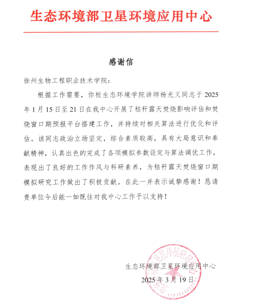 近日,生态环境部卫星环境应用中心向我校发来感谢信,赞扬生态环境学院讲师杨光义在秸秆露天焚烧影响评估及焚烧窗口期预报平台搭建工作中表现出色。