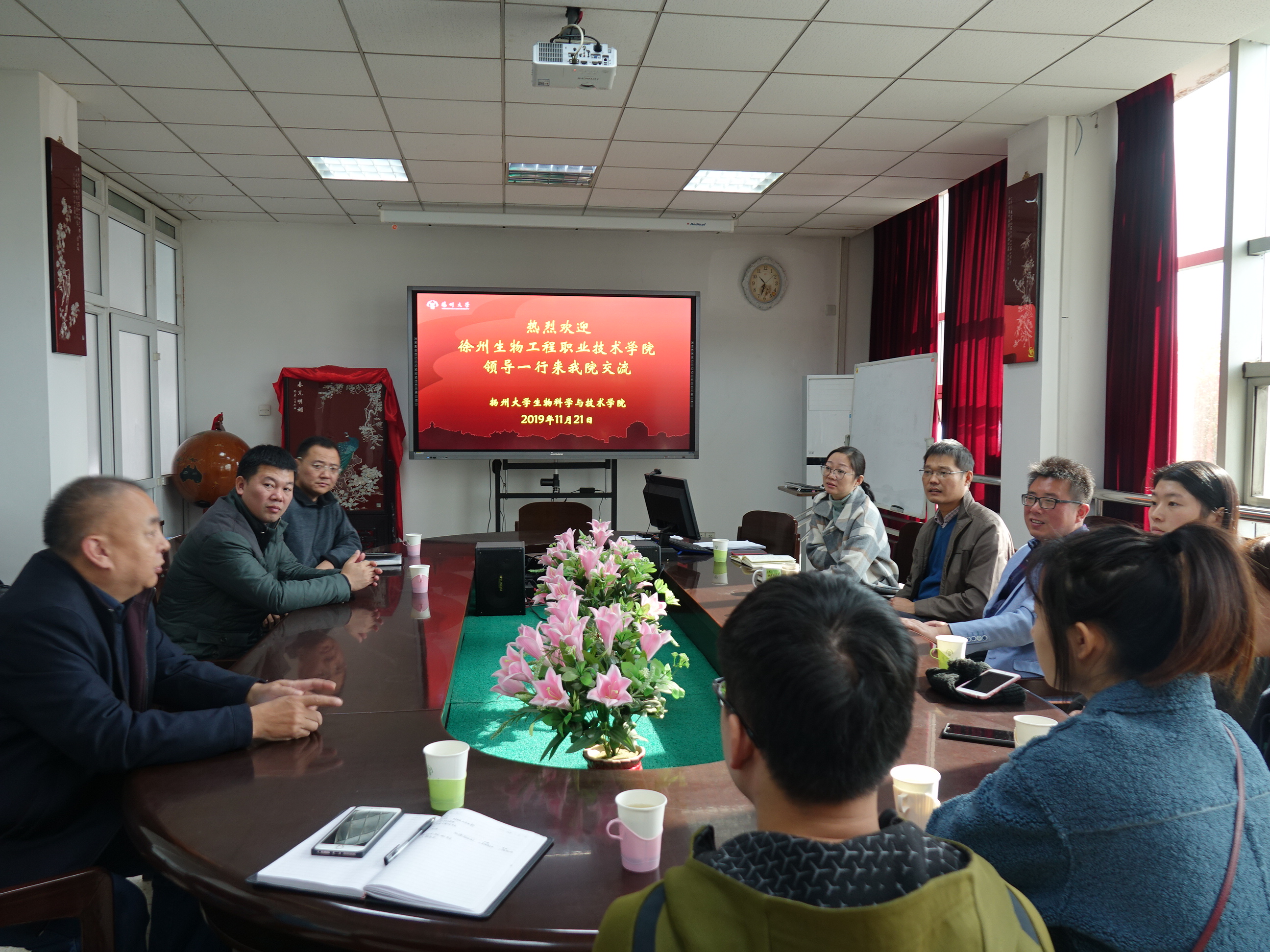 11月21日上午,生物工程系宋凯主任、王印副书记赴扬州大学洽谈专接本合作事宜,受到了扬州大学生物科学与技术学院的热情接待,双方随后举行了座谈会。生科院书记王建军、副书记廖善光、办公室主任杨晶、秘书宋珍珍等出席了座谈会。座谈会上,双方就“生物制药”专业专接本合作的规章流程、生源状况、就业情况、发展前景等具体问题进行了认真细致的交流和研讨,并达成了共识。