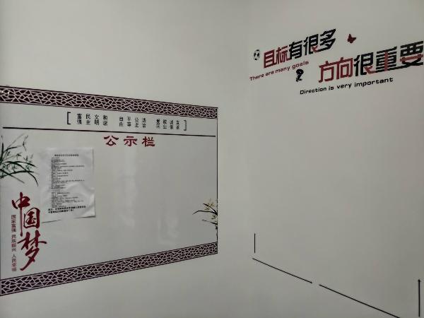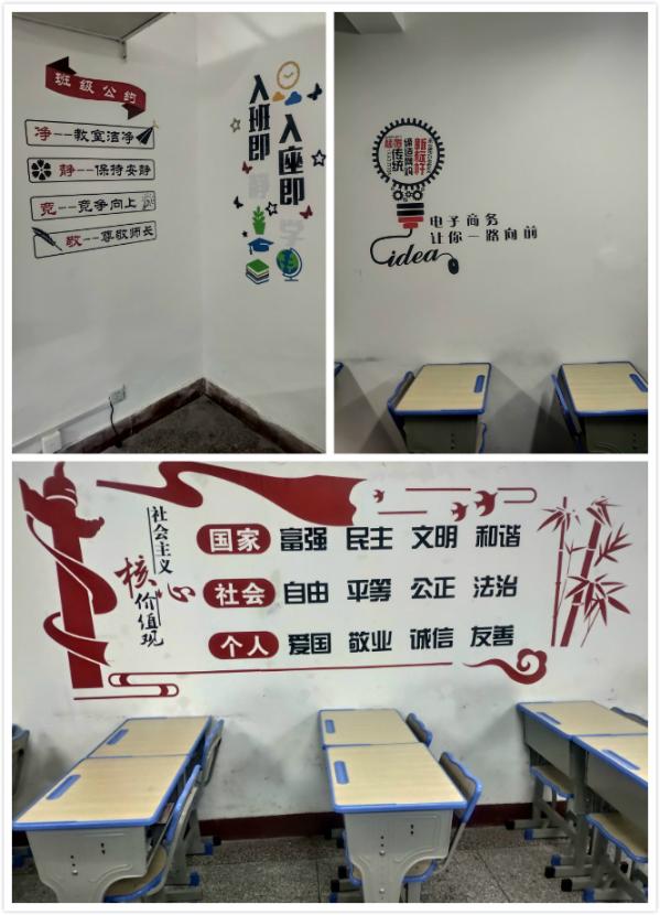 各班师生结合本班的实际情况和专业特色,本着“教育、实用、美观”的原则,认真规划、精心准备、巧妙构思,各班的教室布置整齐划一,融人文性、专业性、教育性为一体。“班级布告栏”整洁美观,“卫生角”干净整齐,正面墙上悬挂国旗和班训,墙面两侧张挂名言警句、专业介绍等。