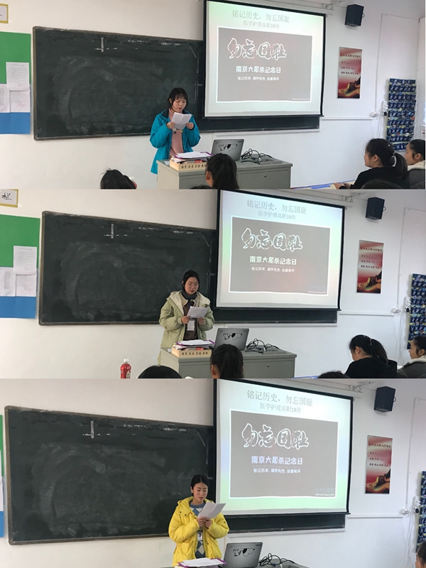 为纪念“南京大屠杀死难者国家公祭日”,医学护理系开展了以“铭记历史、勿忘国耻”为主题的爱国主义教育主题班会,在系团总支的精心准备下,活动于12月9日下午顺利开展。