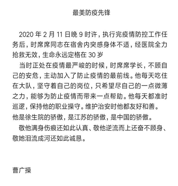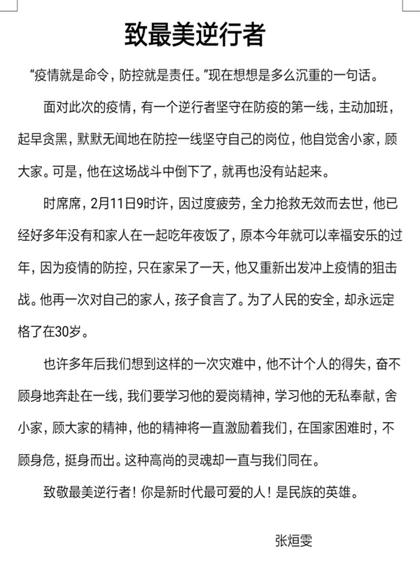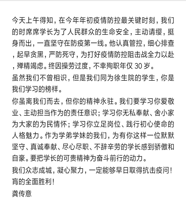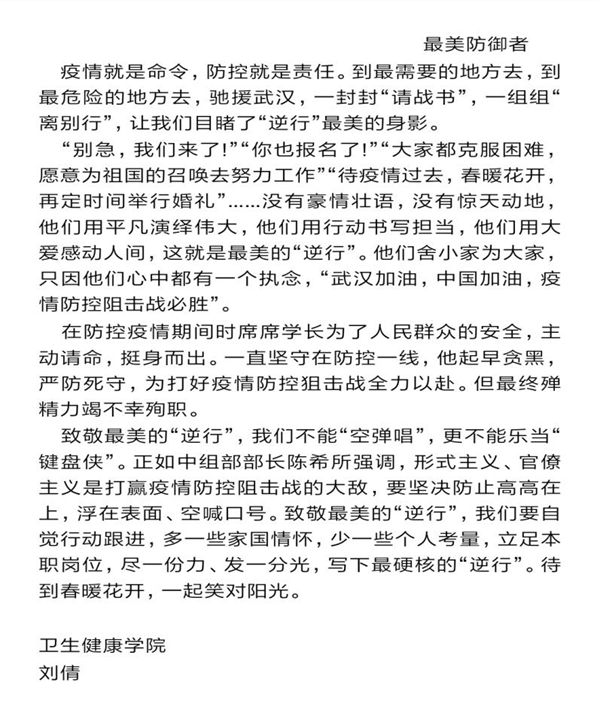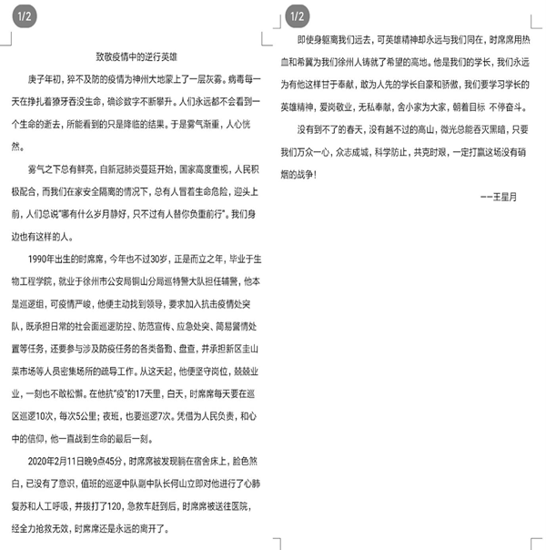 为深入学习贯彻习近平新时代中国特色社会主义思想,坚定理想信念,加强党、团员队伍建设,培育和践行社会主义核心价值观,弘扬爱国主义精神,按照院党委统一工作安排,2020年3月6日,卫生健康学院组织全体师生共同线上学习我院优秀校友——英雄时席席同志的先进事迹。