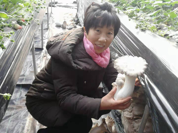 走进草莓大棚,放眼望去,一颗颗鲜红的草莓明艳动人,一簇簇扇形的蘑菇竞相生长。小彭夫妇开心地说,“这个套作模式真管,受疫情影响还不大,俺家草莓亩增产800多公斤,又多收了三茬蘑菇,俺一个棚就多挣了大约3.5万元。”