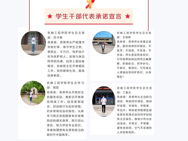 五月初夏,草木欣然。伴随着我校复学的顺利有序进行,美丽的徐生校园逐渐恢复了往日的活力和生机。为有效落实校园常态化疫情防控工作,积极引导学生严格遵守“四个一律、四个必须”校园防疫要求,5月2日-5日,农林工程学院组织开展“校园防疫,我承诺”线上主题团日活动。