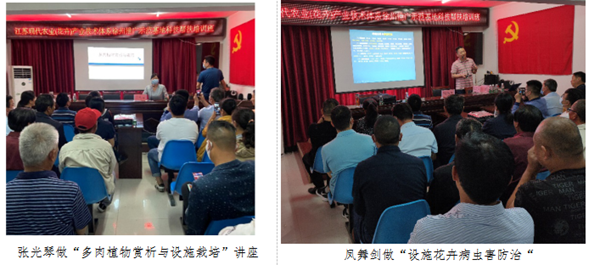 在睢宁县睢河镇,专家团队举办了花卉栽培技术培训,就农技人员和花农所关注的多肉植物设施栽培技术、设施花卉病虫害发生规律与防治、花卉产业现状及发展趋势等问题有针对性地给予专题指导。培训老师张光琴、凤舞剑就学员们提出的问题给予耐心的解答,学员们纷纷表示非常满意本次培训的效果。