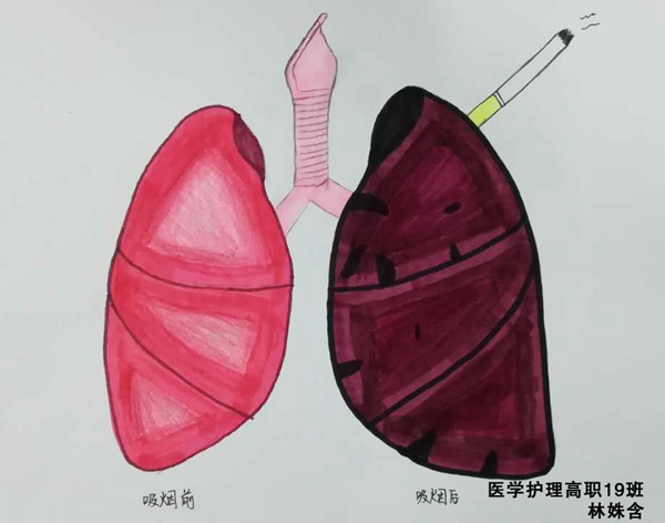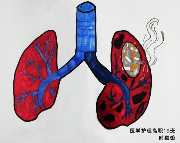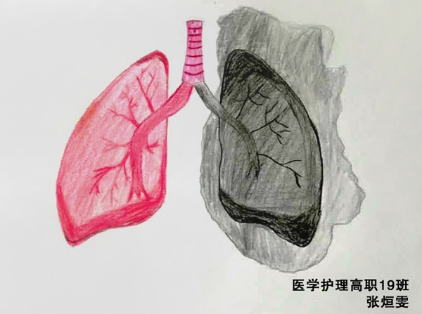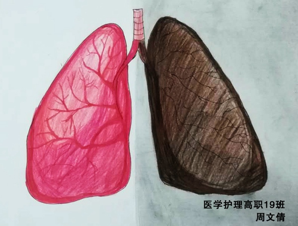 5月31日是世界第33个无烟日,为了保护青少年健康,科学引导青年学生树立拒绝传统烟草产品和电子烟的健康理念,创造一个无烟的健康环境。在世界无烟日期间,卫生健康学院开展了“世界无烟日——吸烟前后肺部解剖对比图”绘画比赛,同学们结合自己所学专业,用手中的画笔绘制出一幅幅形象的肺部解剖图。经过专业老师认真评审,最终评出一等奖1名,二等奖2名及三等奖3名。