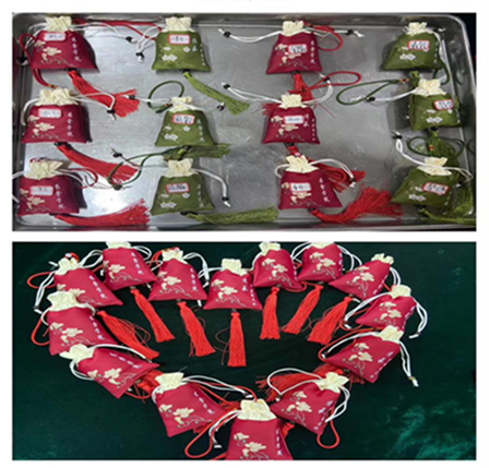 活动中,蔡琳老师首先向学生讲解了中药香囊的起源和制作方法,普及了各种中药配方的功效,并指导学生进行等子称重、冲钵碎药和研槽研粉。随后,谢昕老师带领同学们认识了白芷、丁香、藿香、菖蒲、薄荷、金银花等多种中草药材,讲解它们的用途和功效,并带领学生分小组分别配制了适合幼儿、青年、老年人佩戴的香囊。在同学们的积极参与下,大家齐心合力制作了各种颜色鲜艳、美观大方、芳香宜人的中药香囊。