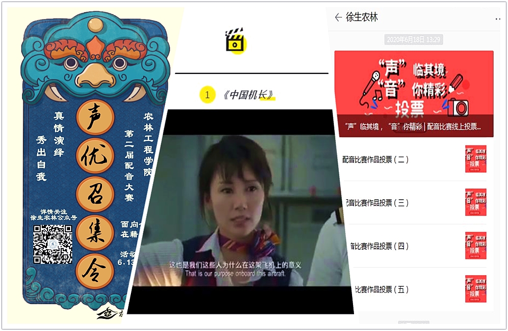以声音为媒,借云端桥梁,展魅力自我。本次配音大赛得到了各二级学院学子的大力关注和支持,在线收到配音作品共55件。《大鱼海棠》、《小丑》、《哪吒之魔王转世》……这些经典影视剧作的精彩桥段层出不穷,一句句经典台词,一个个角色的成功塑造,同学们以声音多变、理解到位、情感丰富的优秀配音素养为大家呈现了一场震撼的视听盛宴。在初选的基础上,《中国机长》等14个优秀配音作品被推到“徐生农林”公众号进行网络公开投票,结合投票结果和评委老师打分,最终评选出一等奖1名,二等奖3名,三等奖5名。