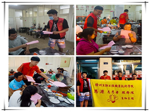 我院思源志愿者服务队在暑期进行了珍惜粮食、节约用餐志愿活动,志愿者们主动到各饭店分发“杜绝舌尖上的浪费”宣传单,向顾客宣传勤俭节约的重要性,号召大家行动起来,节约粮食,点菜不浪费,若有剩余的尽量打包,形成良好的社会风尚。