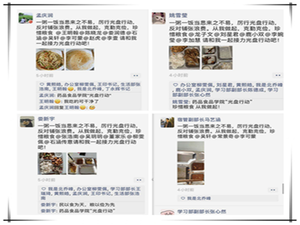 我院在学生中发起“光盘大接龙”活动,学生通过网络把自己一日三餐的“光盘”晒出来,我院学生纷纷响应“光盘行动”的号召,将“光盘”活动接力下去。学生会主席王宇翔说:“我院发起的光盘接龙很有意思,也是对自己的约束,从一日三餐做起,从不浪费一碗饭、一粒米做起,做一个勤俭节约的大学生”。同时,我院还制作签名板,举行“从我做起今天不剩饭”集体签名活动,学生们踊跃签名,纷纷表示愿意响应号召,加入到珍惜粮食的队伍中来。