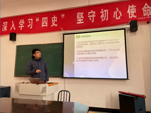 活动伊始,由杜安原老师根据学校课程思政教学比赛要求,进行说课及课程思政教学展示。杜老师把技术创造价值的意义、一丝不苟的工作态度、探究精神、理论指导实践的思维方法、创新精神的培养,融入到《三相异步电动机反接制动控制电路》的教学过程中,采用了情景教学、任务驱动、实例讲授等教学方法,通过新课引入、原理讲解、器件介绍、典型电路讲解、课堂小结、拓展思维等一系列环环相扣的教学环节,展示了课程思政教学的实施过程。