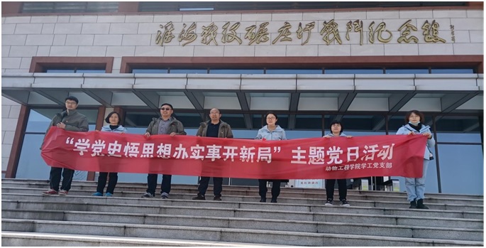 为缅怀革命先烈,切实加强党员的爱国主义教育,增强党组织的凝聚力和战斗力。3月28日上午,动物工程学院学工党支部组织全体党员前往邳州淮海战役碾庄圩战斗纪念馆,接受革命传统教育。 上午10点左右,在动物工程学院党总支书记葛启蒙的带领下,全体党员首先来到广场中央,瞻仰英雄群像纪念碑。随后,进入纪念馆展厅,近距离感受由照片、文字、视频、雕塑等方式呈现出来的昔日淮海战役的壮观场面。党员们认真观看一件件珍贵的历史文物,阅读展板上的图文信息,对淮海战役的历史经过、先烈们前赴后继奋勇杀敌的英雄事迹,有了更为深刻的了解和感悟。 春风已解碑上雪,红色精神永长存。此次主题党日教育活动,通过缅怀先烈,重温革命历史,使全体党员在精神上受到再次洗礼。同时也让“铭记历史,不忘初心、牢记使命”的誓言在行动中得到了自觉地践行!
